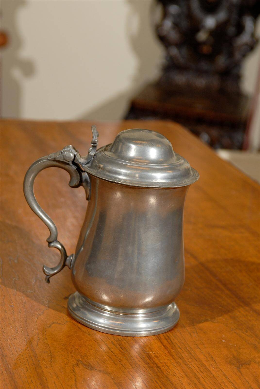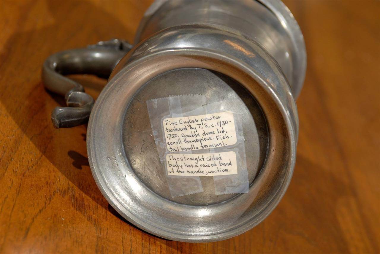 This is a charming English pewter flagon that holds 1 quart. It was hand hammered by Townsend in London c. 1730 – 1750. Pewter of this kind was used for eating, drinking, and celebrating on a daily basis until the 19th century. This flagon has a double dome lid and scroll thumb piece for comfort while carrying. There is a beautiful fish tail handle terminal and the straight sided body has a raised band at the handle junction.