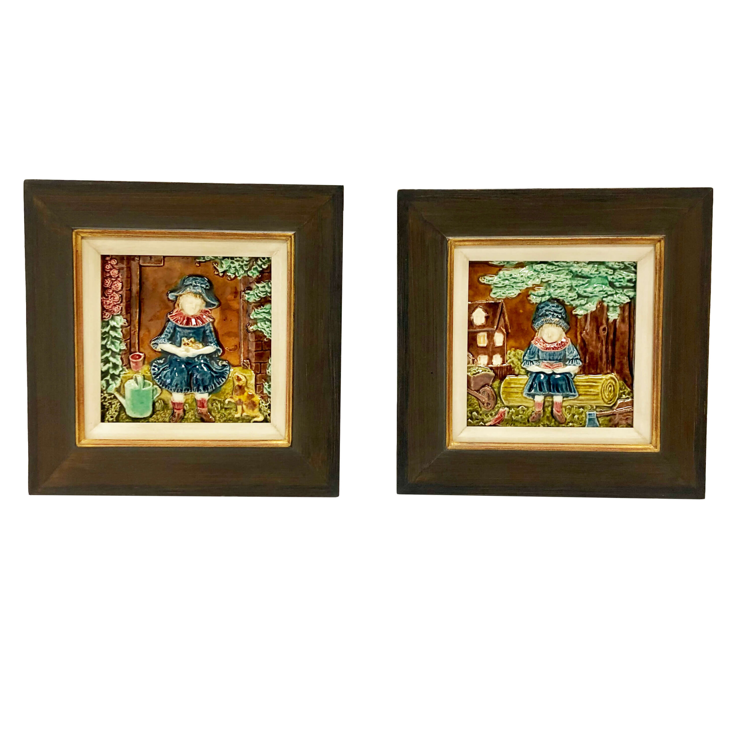 German majolica tiles that have been framed.